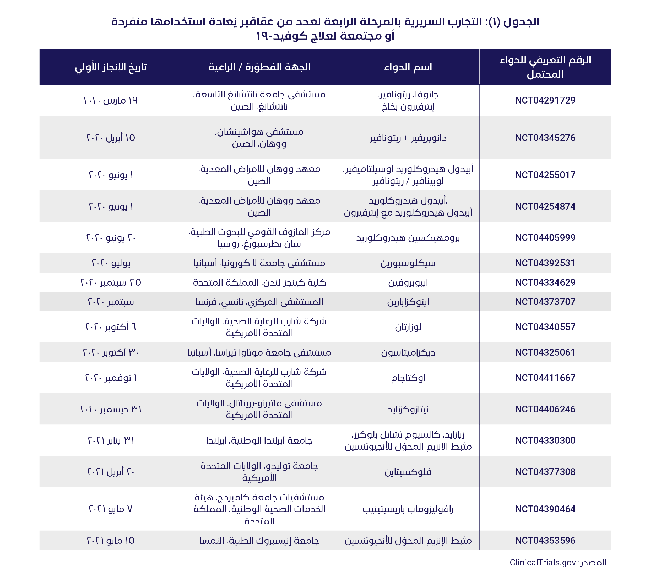 وأخيرًا، كشفت المؤشرات الإيجابية الأخيرة لإعادة استخدام العقاقير المضادة للفيروسات عن فاعليتها المحتملة في مواجهة فيروس كورونا في حال أُخذت مجتمعة، ولا تزال هذه الملاحظات قيد الفحص والتأكد من خلال استخدامها في تجارب سريرية على نطاق أوسع.
