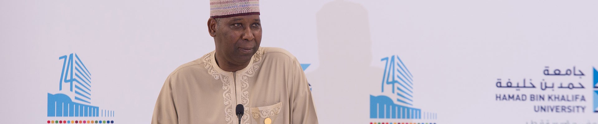 استضافت جامعة حمد بن خليفة، بتاريخ 15 ديسمبر، سعادة السيد تيجاني محمد باندي، رئيس الدورة الرابعة والسبعين للجمعية العامة للأمم المتحدة، الذي ألقى محاضرة عامة أعقبتها جلسة نقاش تفاعلية.