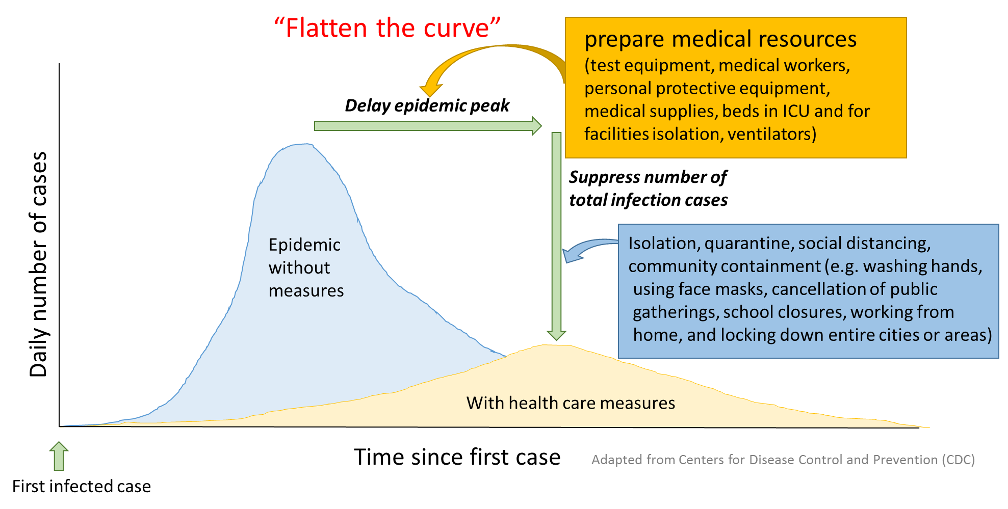 وتتمثل الاستراتيجية الحالية في معظم البلدان في كيفية "تسطيح المنحنى"، مما يعني توزيع معدل الإصابة على مدى فترة زمنية أطول من خلال الحجر الصحي، والتباعد الاجتماعي، والعمل والتعليم عن بُعد، وتعليق التجمعات. وقد أثبتت هذه التدابير فعاليتها خلال فترة انتشار وباء سارس في عام 2003 (8).