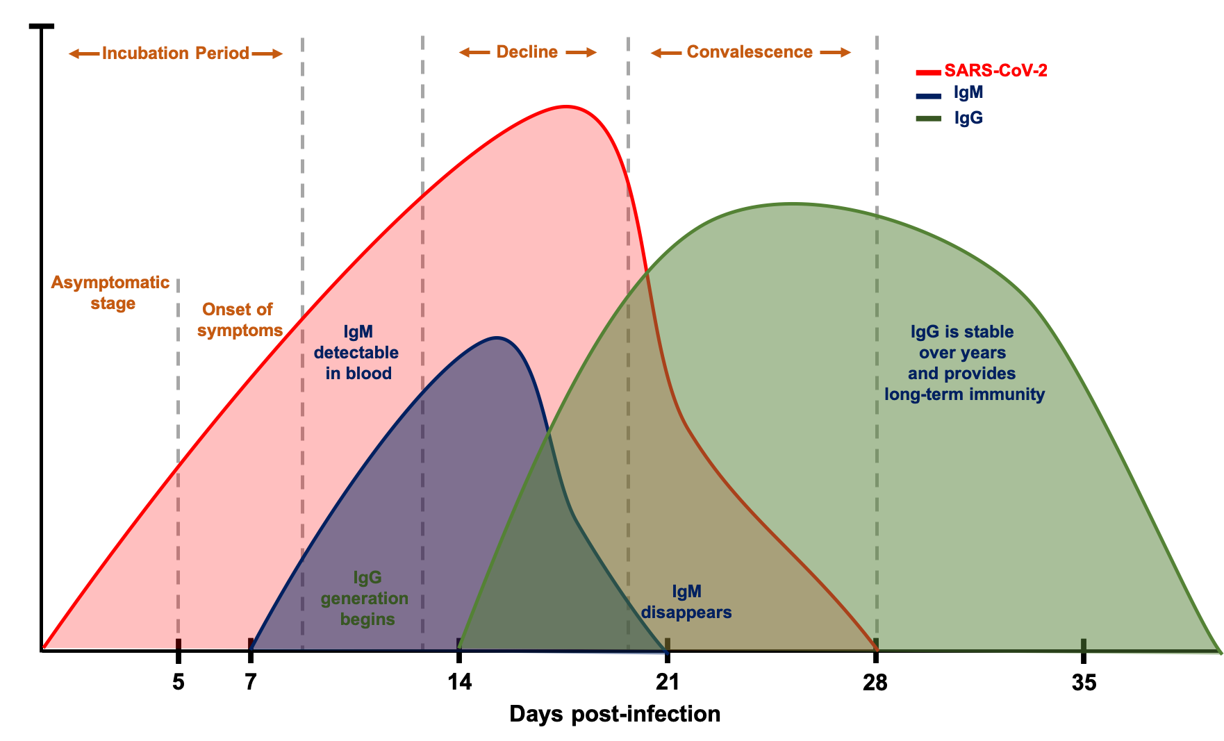 وحتى نتمكن من تنفيذ الاختبارات المصلية بشكل صحيح في مكافحة فيروس كورونا، نحتاج إلى فهم كيفية تفسير مستويات الأجسام المضادة في الدم، حيث تنقسم الأجسام المضادة ذات الصلة إلى نوعين: الأجسام المضادة (IgM)، الأولى التي تتولد نتيجة للاستجابة المناعية والتي تنخفض مستوياتها بسرعة، والأجسام المضادة (IgM) من مجموعة الجلوبولين المناعي، التي تبدأ مستوياتها في الارتفاع بعد بضعة أيام وتستمر لفترة أطول في الدم (15-13).