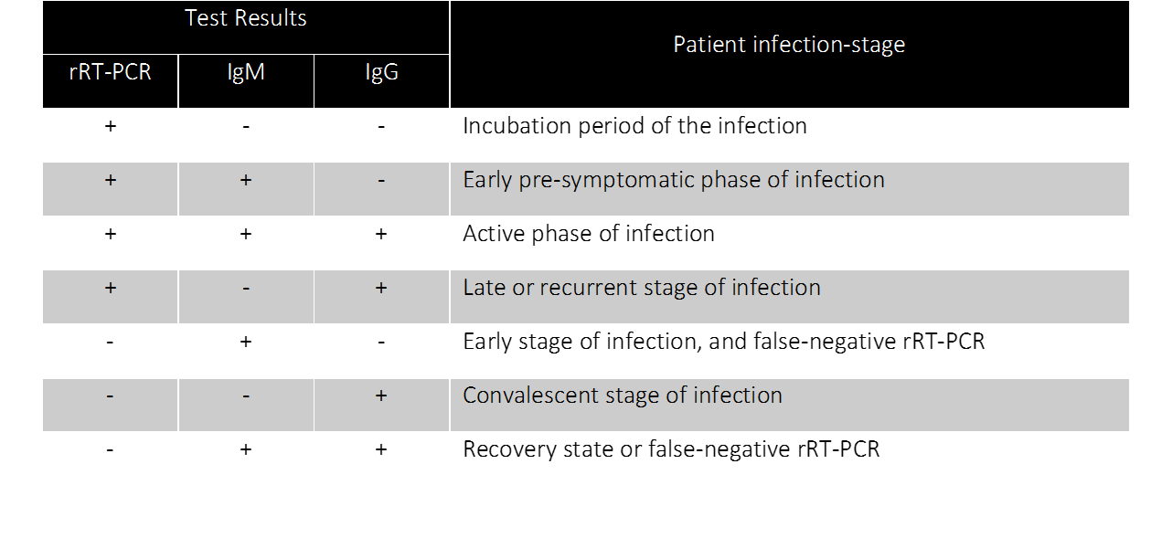 يلخص الجدول أدناه المعلومات المتاحة في الوقت الحالي حول مسار المواد الجينية الوراثية لكوفيد-19، والأجسام المضادة (IgM) و(IgG)، في أعقاب الإصابة بالعدوى. ففي حين أن مستويات IgM / IgG تقدم رؤية شاملة لدورة المرض فيما يتعلق بفيروس كورونا، فإن الأجسام المضادة لا يمكن اكتشافها في الدم قبل ظهور الأعراض. وبعبارة أخرى، فإن الاختبار المصلي IgM / IgG لا يعد الأمثل للكشف المبكر عن كوفيد-19. وقد اُقترحت عدة سيناريوهات لتفسير مستويات الفيروس والأجسام المضادة IgM / IgG. إيجابية الاختبارات الثلاثة تعني أن الشخص في مرحلة الإصابة النشطة، في حين أن إيجابية الكشف عن (IgM) فقط قد تعني أن اختبار الكشف عن الفيروس كوفيد-19 في حال كان سلبيًا هو غير صحيح. ولعله من أهم السيناريوهات المحتملة، إيجابيه اختبار IgG وسلبيه اختبار IgM، حيث تشير إلى شخص في مرحلة النقاهة وبالتالي يمكنه العودة إلى العمل. ولفهم المرحلة المرضية، ودمج المرضى في التجارب السريرية، وتحديد المرضى الذين تعافوا ويمرون بفترة النقاهة، حيث يعد الجمع بين اختبار تفاعل سلسلة البليمراز مع التنسخ العكسي في الوقت الحقيقي والاختبارات المصلية أمرًا بالغ الأهمية (16).