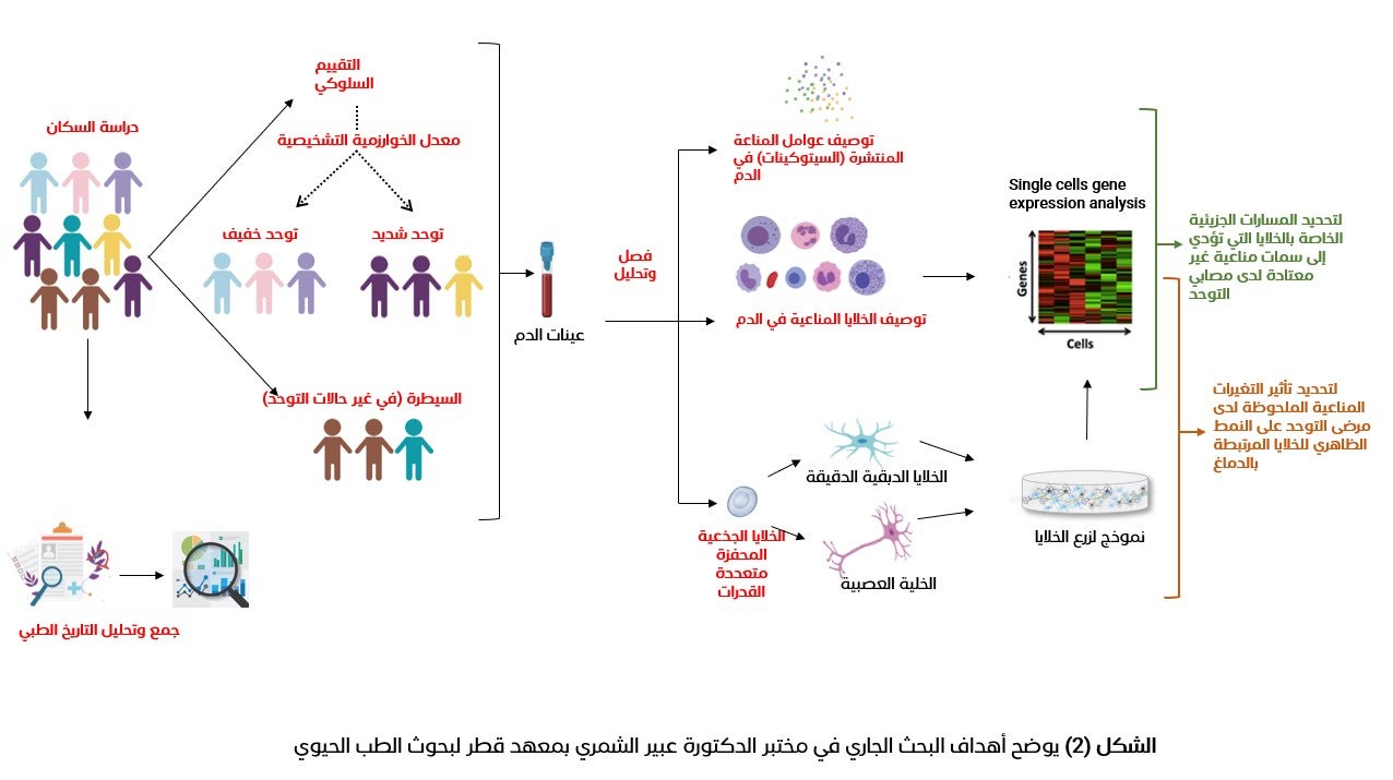 في معهد قطر لبحوث الطب الحيوي، يلتزم مختبر الدكتورة عبير الشمري بمعالجة هذه الجوانب ذات الأهمية الكبيرة فيما يتعلق بالفهم الأساسي للفيزيولوجيا المرضية للتوحد (الشكل 2). ويتعاون مختبر الدكتورة عبير مع جهات محلية وطنية، مثل مركز تطوير الطفل التابع لمؤسسة حمد الطبية، لتسجيل الأطفال الصغار المصابين بالتوحد، ومع مؤسسة الرعاية الصحية الأولية في تسجيل ضوابط المواءمة (الأطفال الذين لم يتم تشخيص إصابتهم بالتوحد). ويجري تقييم المشاركين المسجلين من الناحية السلوكية، وتجميع تاريخهم المرضي وعينات الدم. وفي مختبر الدكتورة عبير، يتم عزل وتحليل الخلايا المناعية في عينات الدم من أجل التعرف على نوع محدد من الخلايا المناعية التي يتم تعديلها لدى مجموعة من الأفراد المصابين بالتوحد. وبعد ذلك، يقومون بفحص الآليات الجزيئية الأساسية وتفاعلات الشبكة التي من المحتمل أن تؤدي إلى هذا الخلل الوظيفي؛ لاستهداف هذه العوامل في النهاية كإمكانية للوصول إلى علاج للتوحد في المستقبل. بالإضافة إلى ذلك، يهدف مختبرها أيضًا إلى دراسة الصلة الإكلينيكية التحويلية لمثل هذا التغيير في الخلايا المناعية المنتشرة بالنمط الظاهري ووظيفة الخلايا المرتبطة بالمخ، مثل الخلايا العصبية والدبقية الدقيقة، التي تُنتج في المختبر كنماذج لزرع الخلايا.