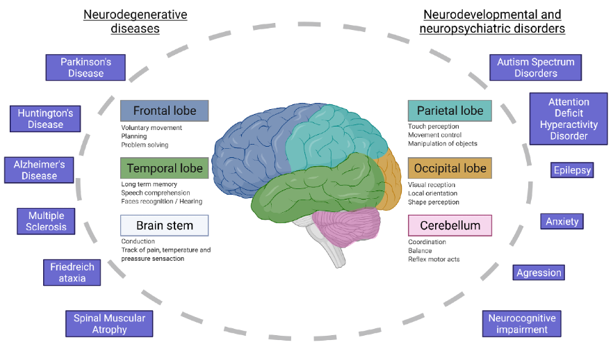 Figure 1: Brain lobes and functions. Major neurodegenerative diseases and neurodevelopmental/neuropsychiatry disorders.