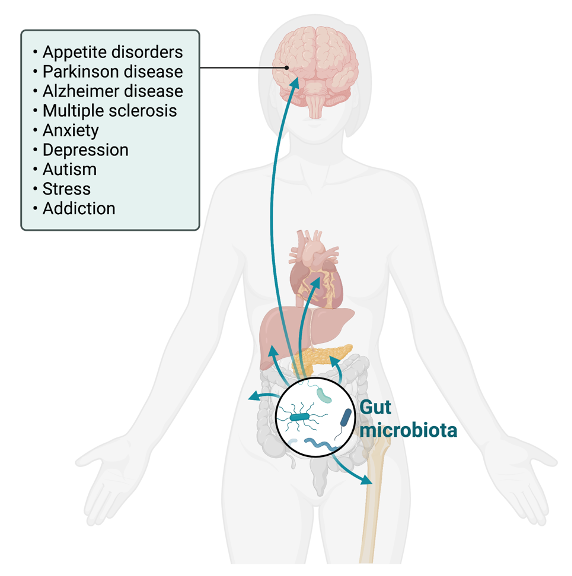 More recently, considerations of the influence of the microbiota inside the gut have shed light on our understanding of brain and central nervous system disorders. Moods, decisions, and behavior are not solely determined by the brain. Gut-brain axis, the imaginary axis linking the brain to the gut, is one of the frontiers of neuroscience (Figure 3).