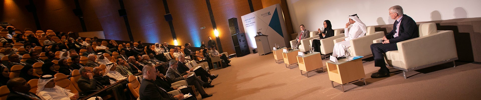 A panel discussion on “University Research: Successful Paths to Technology Transfer, Licensing, and Commercialization” was moderated by Dean Mounir. The panelists included His Excellency Dr. Mohammed Saleh Al-Sada, former Minister of Energy and Industry; Dr. Hessa Al-Jaber, former Minister of Information and Communications Technology, and Chairperson of the Qatar Satellite Company; and Dr. Richard O’Kennedy, Vice President for Research, Development, and Innovation at Qatar Foundation, and HBKU Vice President for Research.
