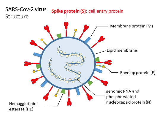 The viral spike protein has two parts, S1 and S2. At first, the surface S1 part binds to host cell ACE2, and then a type of ‘molecular scissor’ on the host cell (serine protease TMPRSS2) cleaves the S protein called S protein priming (4).