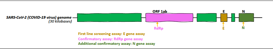 The current gold-standard diagnostic test for COVID-19, reverse transcription-polymerase chain reaction (RT-PCR), relies on detecting unique regions in the SARS-CoV-2 genome (11). In January 2020, the World Health Organization (WHO) published the first protocol with three RT-PCR tests designed to detect three different genes of the virus: 1) the first line of screening is for the E gene, (present in the “E” region that encodes the envelope protein) 2) a confirmatory test for the RdRp gene (in the “ORF1ab” region that encodes well-conserved non-structural proteins), and 3) an additional confirmatory test for the N gene (in the “N” region that encodes the Nucleocapsid protein) (12, 13).